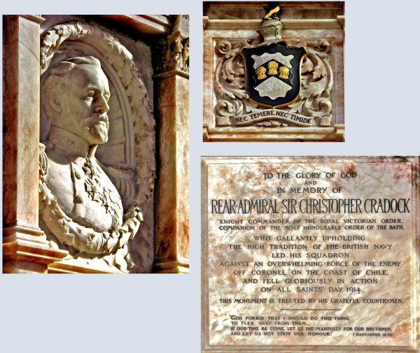 Cradock Memorial, York Minster - 2 Details. The Cradock motto: Nec temere nec timide (Neither rashly nor timidly). Certainly not timid. And he and his men had plenty of time beforehand to prepare for meeting a superior German force; so probably not rash either. Cradock, O'Brien and 1,652 other British sailors died on that All Saints Day in the south-eastern Pacific. |